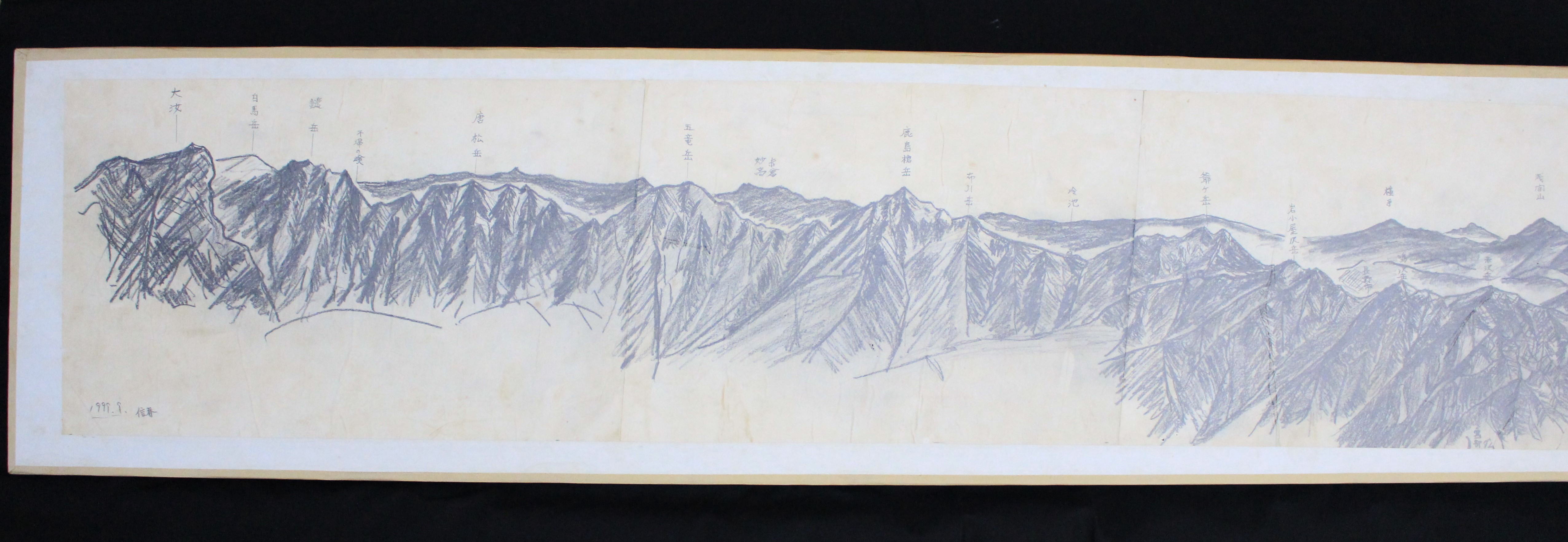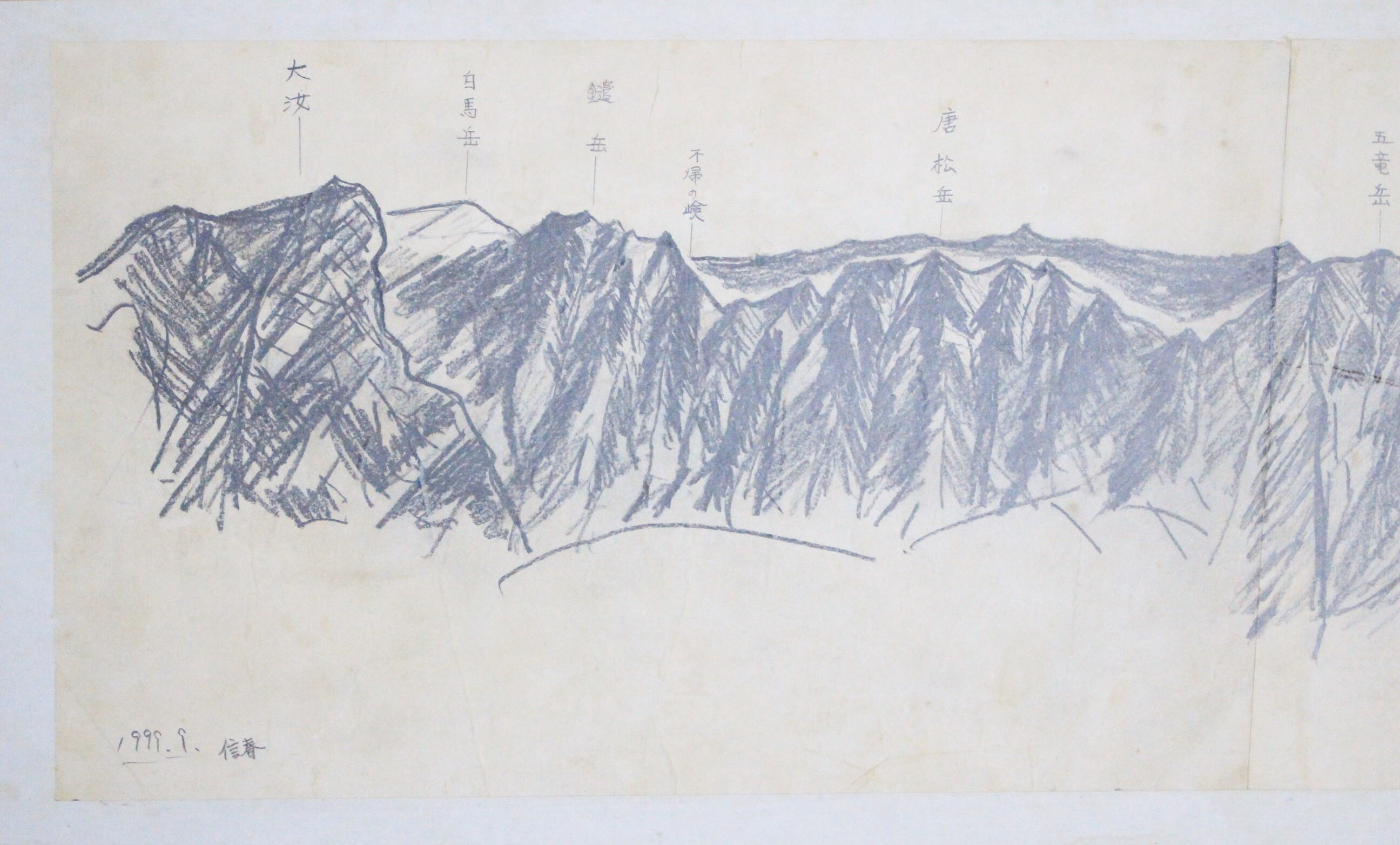 山頂から望む山並みを鉛筆で写した